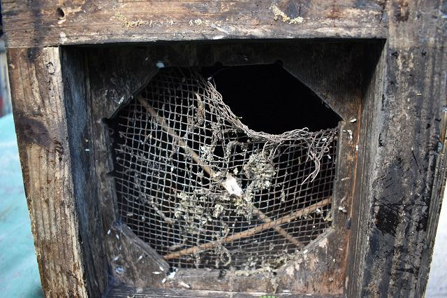 土台の金網は変形して、さらに巣門枠の金網を破って、巣板を食い散らした形跡がありました。巣落ち防止棒も外されていました・・・。