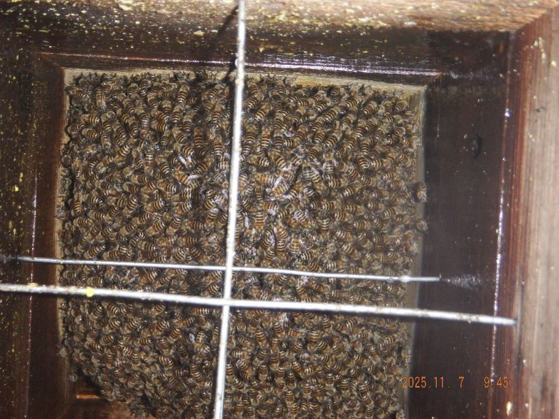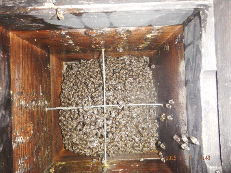 令和7年11月7日 金曜日 自宅蜜源樹の森:10月10日入居群の逃居に立ち会いましたね。受粉用柿の木を2本購入して、植えていた時の事、分蜂みたいな羽音がして逃居