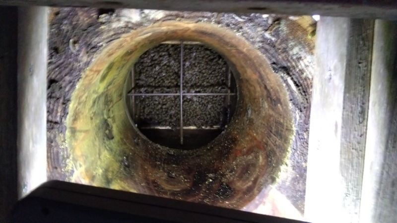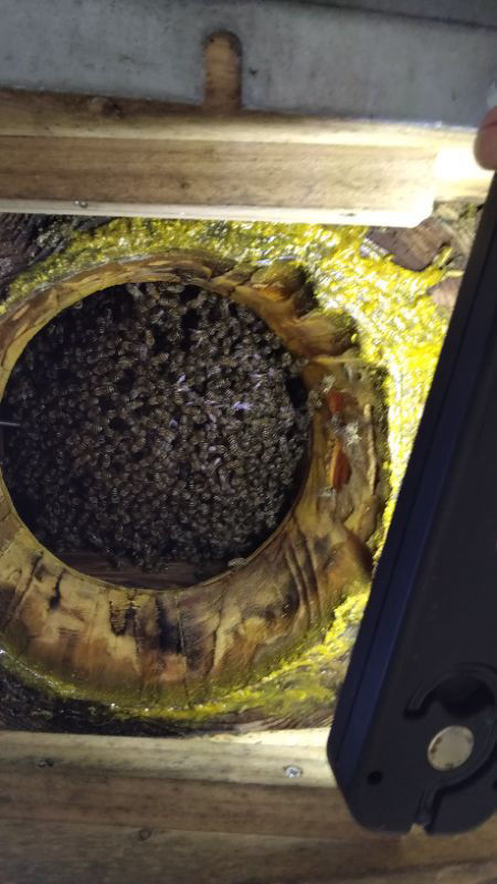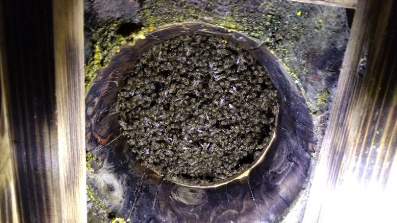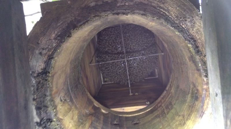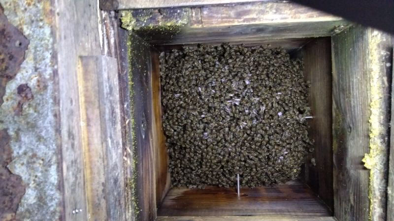 ⇩ キュウイ群、4月7日自主入居、10月半ば内検時に風で枯れた柿木が倒れていた。特に異常は考えなかったが、今回底板を引き抜いたら巣落ちを確認。スムシが蠢いていた。巣落ちは前回の内検では無かったが、倒木が巣箱にぶつかった可能性あり、その後の巣落ちか。