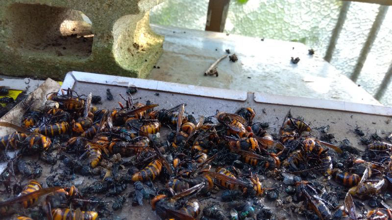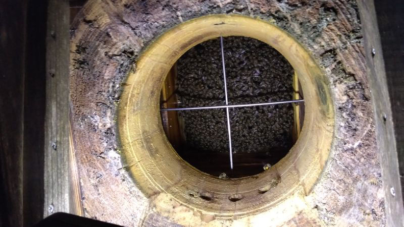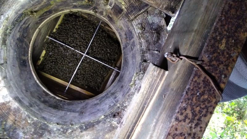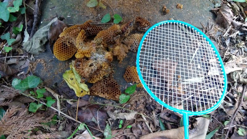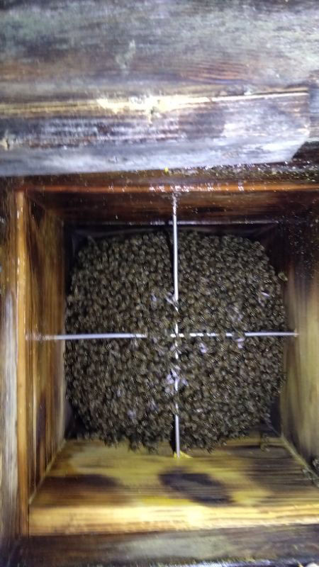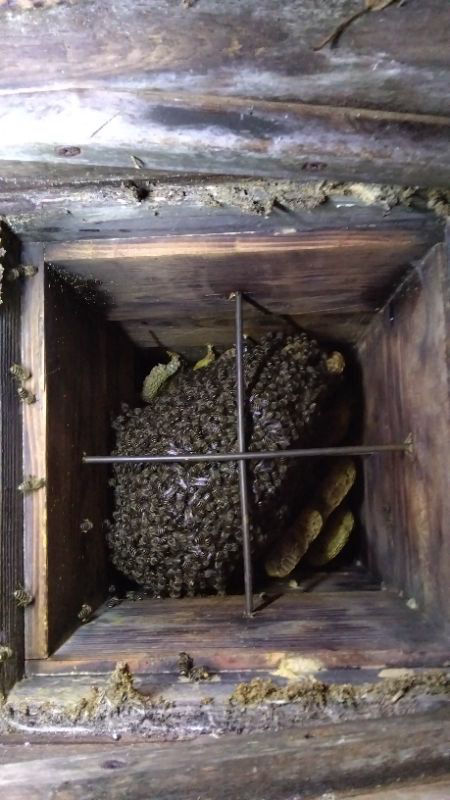 ⇩ 越冬カラス山椒群、夏1回採蜜、以前から空間有り。丸板は内検時ちょっと置いた、意味なし。スズメ蜂は20匹ほどで終了。
