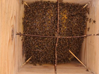 内部(夕方5時頃の様子。4段目の巣落ち防止棒まで巣板が覆っています。)
