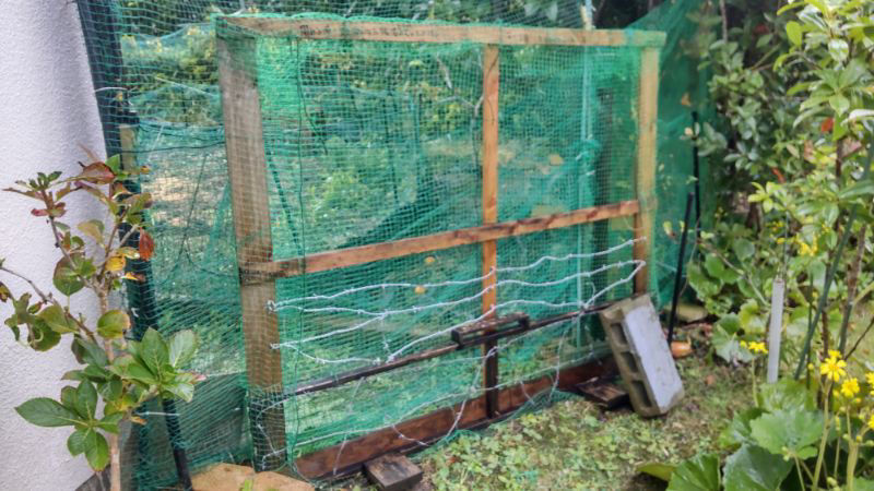 最後に裏側に獣害ネットを全面に張り直しして、出入口木枠扉を補強した。扉は全部で3か所、作業は半日を要して完了。