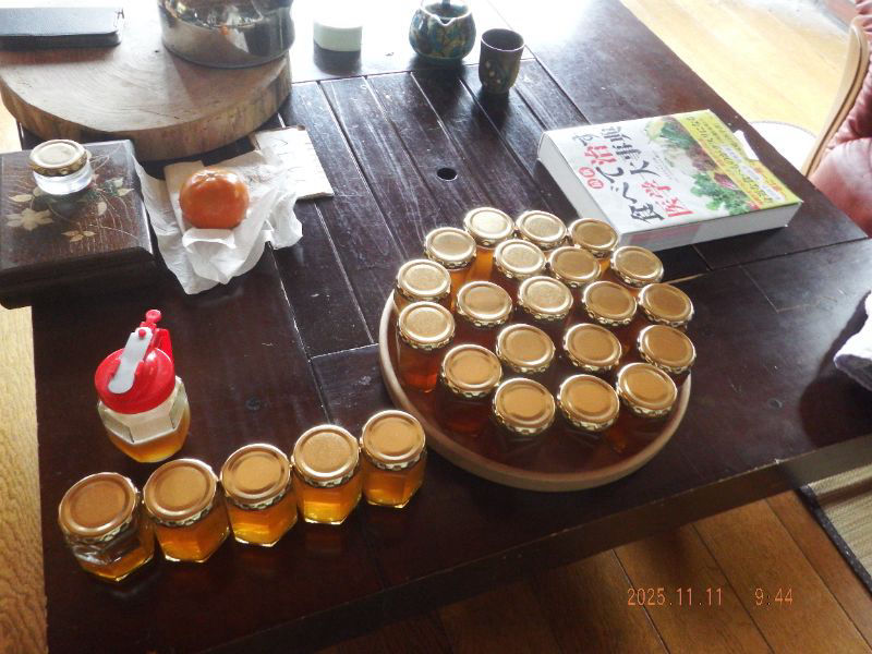 令和7年11月11日 火曜日 大分山荘にて:No.5冬越し群の10日採蜜分を、瓶詰しましたね。