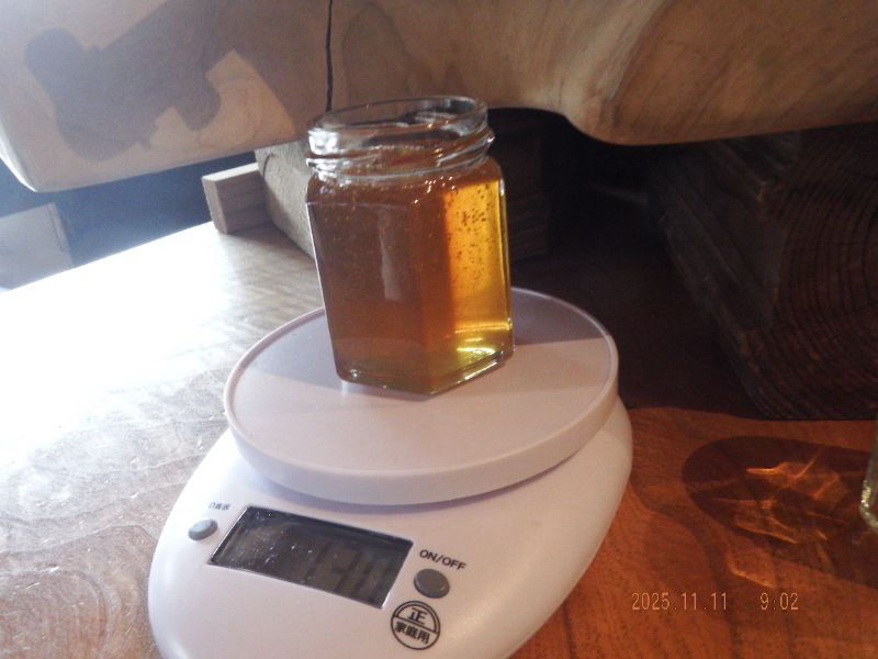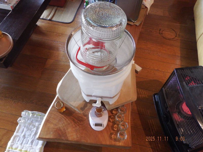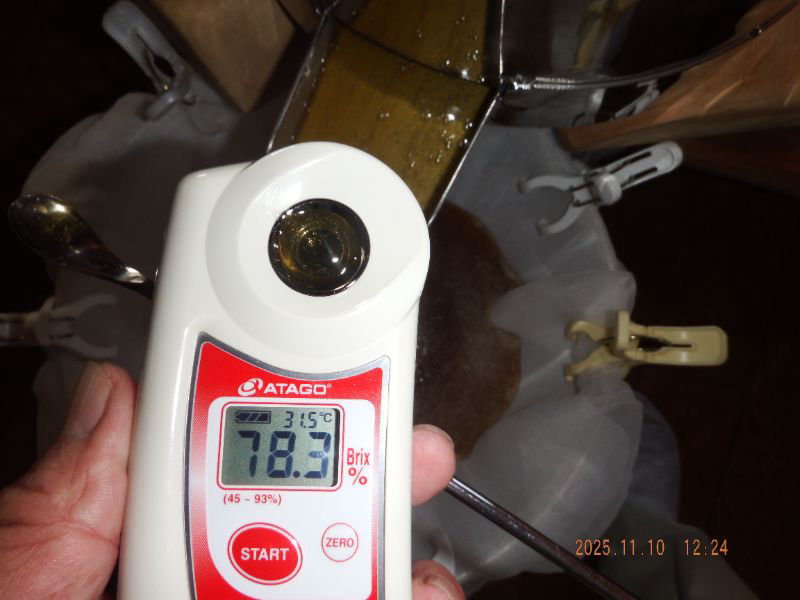 令和7年11月10日 月曜日 大分山荘にて:No.5冬越し群採蜜の垂れ蜜、圧搾りが終わりましたね。やっと貯蜜が出来てましたね。他の群も採蜜出来ますね。何方も採蜜