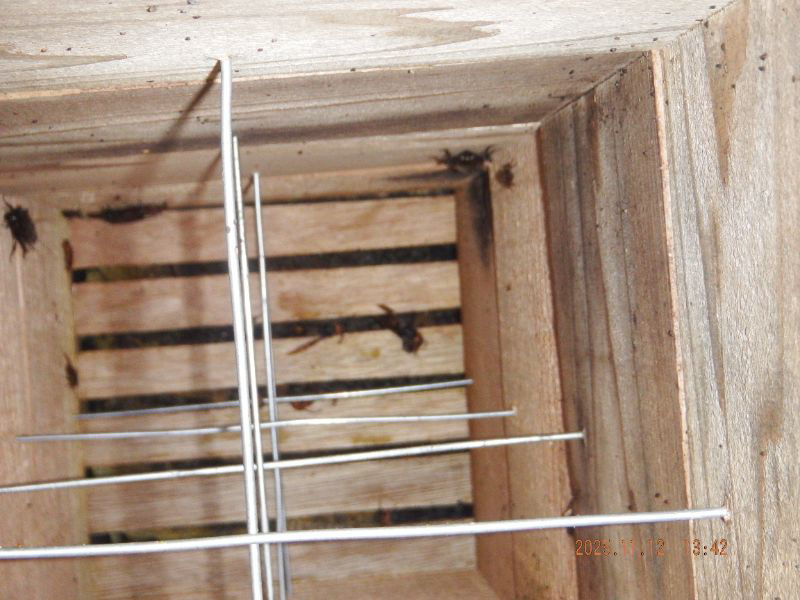 簀の子にオオスズメバチの死骸が有りますね。角洞の10mmの板を何処か破って居ますね。