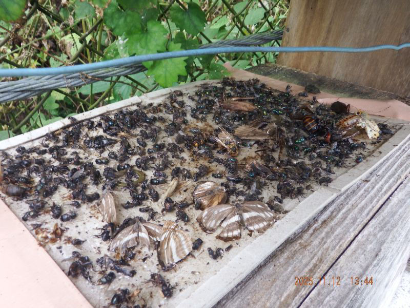 オオスズメバチの死骸とミツバチの亡骸が落ちて来ましたね。中に入られて居ましたね。初めての経験ですね。何処から入ったか後から調べますね。
