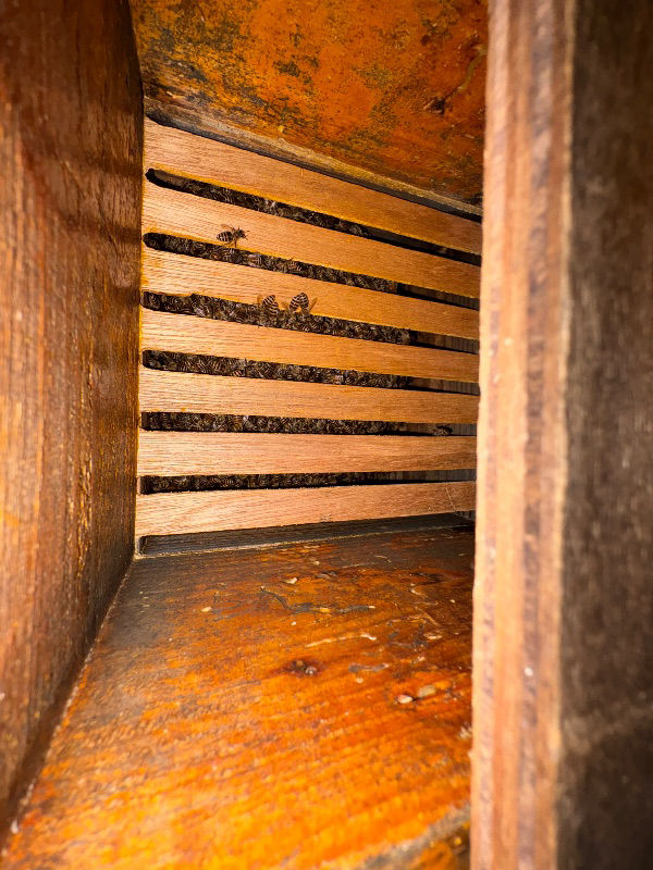 カフェ裏の巣箱 底板引き抜く時のミツバチの反応