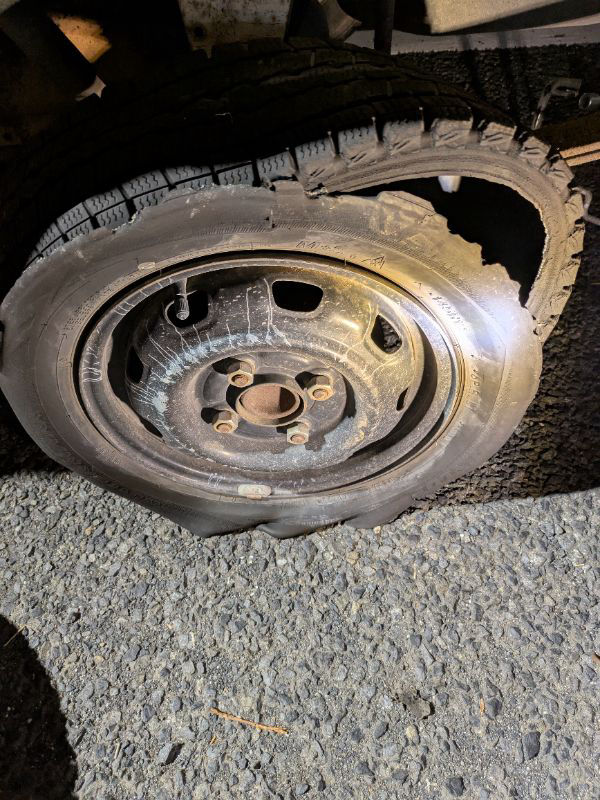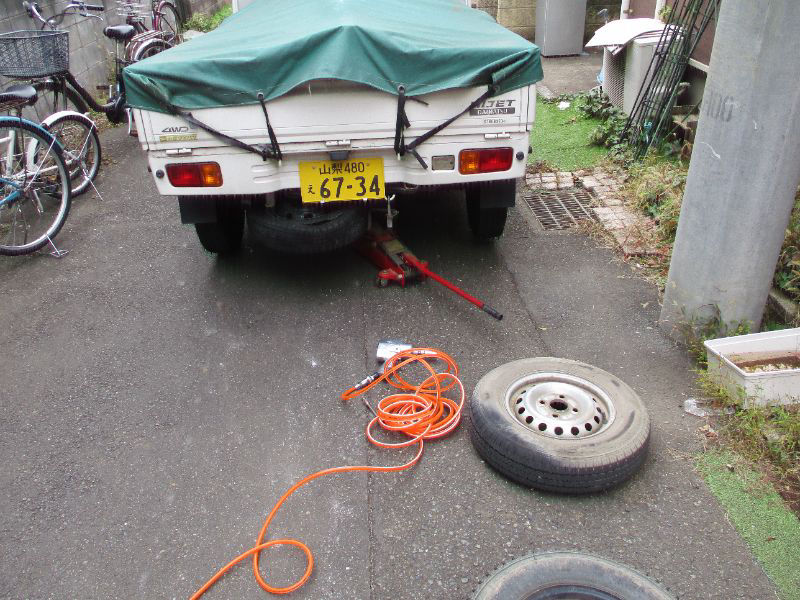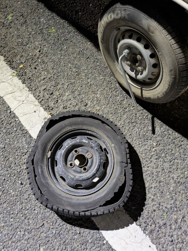 茨城に行っての帰り道、気分良くハンドルを握っていると突然左にハンドルが取られ、後はガタガタの振動に変わります。タイヤのバーストが起きたなと思いましたが、外環道で止める訳にもいかず左に寄せて60Km以下にスピードを落として出口まで4~5Km位をなんとか走り切りました。高速を出てファミマに止めてタイヤを見たら左の後輪が凄い事になってました。完全にタイヤが破れています。ほとんど使った事のない工具を使ってなんとかスペアタイヤと交換しました。ジャッキなんかもほとんど積みっぱなしで使ってないので、回すのに固くて息切れしながら作業しました。年甲斐もなく軽トラでも120Km/hで追い越し車線をかっ飛ばしているので、タイヤが悲鳴を挙げたようです。後続車に間隔を空けて走ってたので急激なスピードダウンにも追突されずに済みました。昔、大阪に行くのに中央道で他人の車を運転しててハイドロプレーニングを起こして約100m位を制御できないまま横向きになって走った(滑った?)事もあります。高速道路でのタイヤのバーストもこれで2回目です。