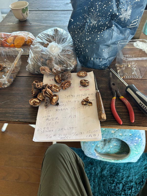 昨日から オカアチヤンが 鹿児島へ 出かけているので 何をするにも 1人 最も困っているのは 炊事 後片付け 暇つぶし? テレビも 見飽きたので、手に入れた 茶箱に 柿渋を塗ってみた。うまくいかない。 すぐ飽きる。今度は クルミを 割って その中身を 穿り出してみた。 コレも 飽きた。 1人でまちなかを 適当に歩く。 結構時間が潰れたなあ。何とか 一日過ごした。明日からは 無計画? また 散歩かな?