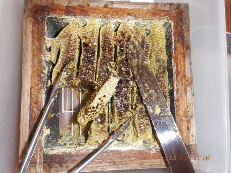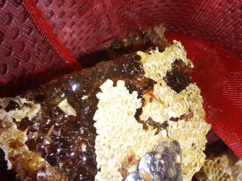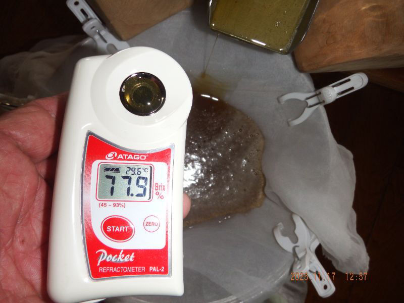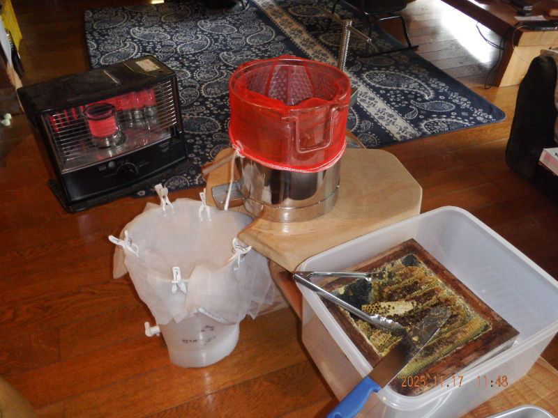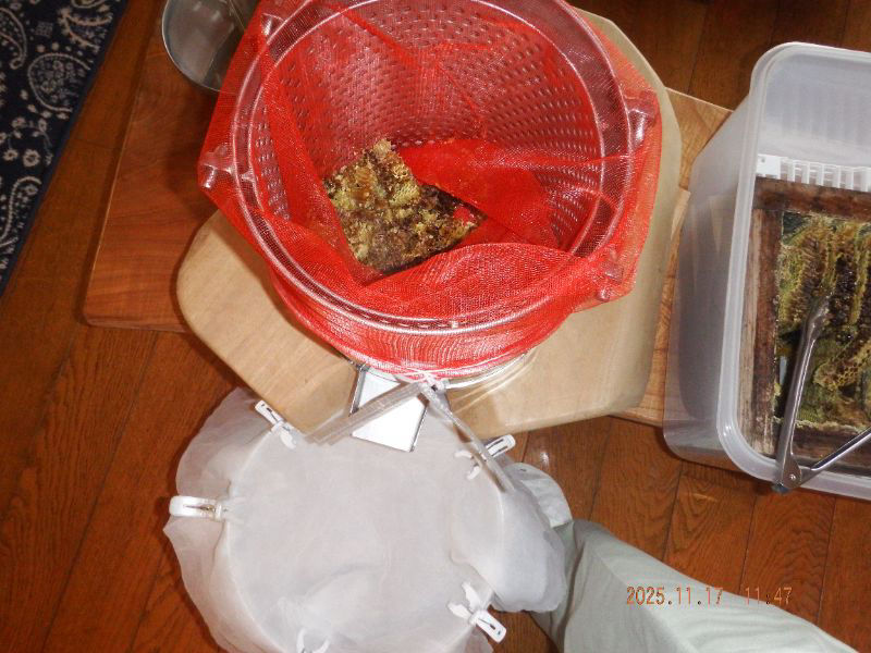 令和7年11月17日 月曜日 大分山荘にて:No.6冬越し群の採蜜分を垂れ蜜をして、圧搾りを致しましたが、少ないですね。