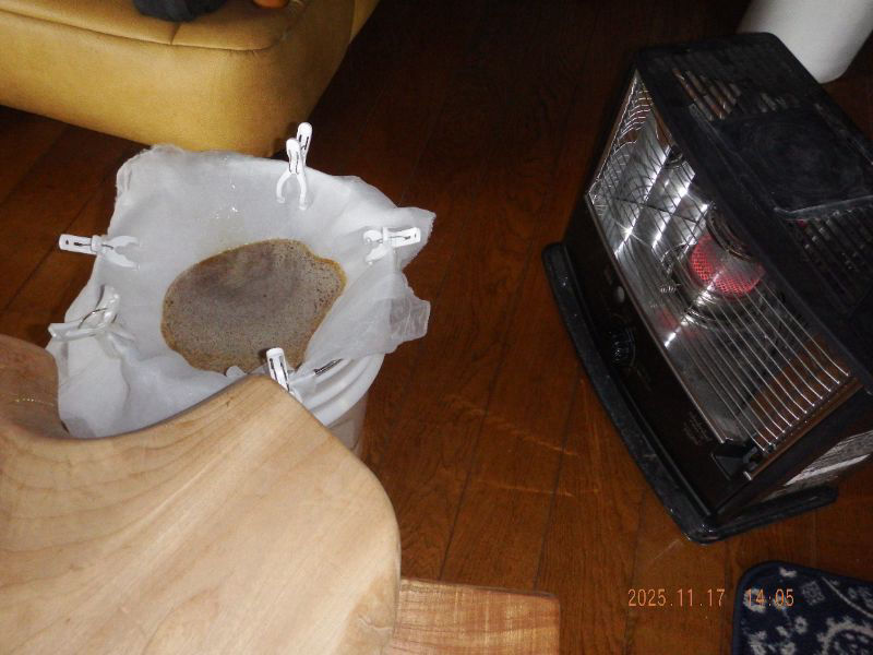 14時05分垂れ蜜が終わりましたが2段階目が落ちないので、ストーブの前に置いて居ますね。