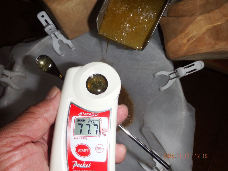 令和7年11月17日 月曜日 大分山荘にて:No.6冬越し群の2回目の採蜜を行いましたね。採蜜量は60%くらいの重さですね。此の群は3段目の採蜜に成りますね。