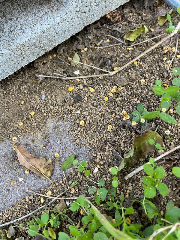 その後、逃去を疑い蜂場の箱を確認したところ、今年入居の1群の下に雄蜂の蓋が多数落ちていることを確認しました。