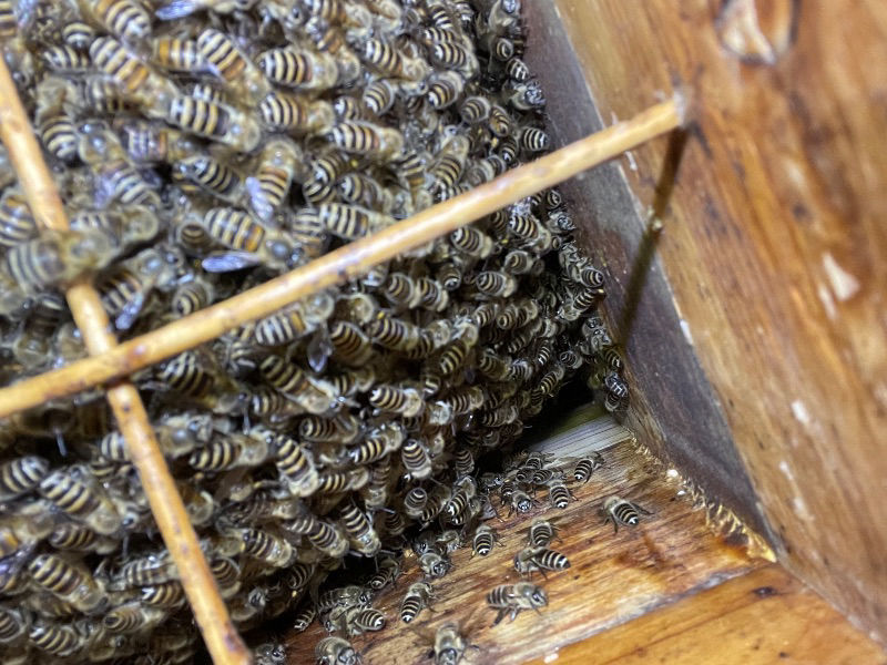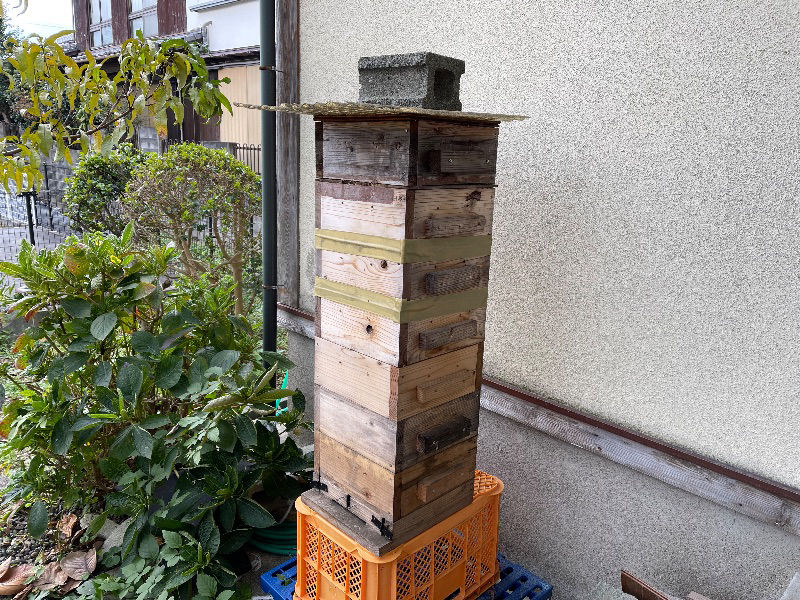 2019年、初めて捕獲箱にミツバチ飛来。西洋ミツバチと判明。 初回の西洋ミツバチ群は育児が始まらないまま消滅 翌年2020年も西洋ミツバチが入居。10枚枠から2...