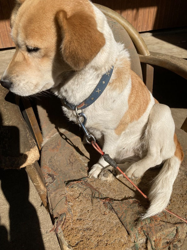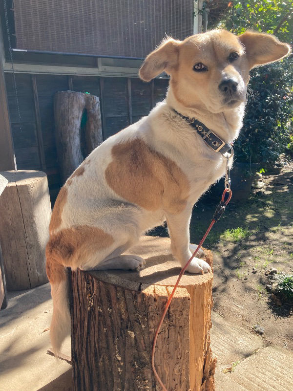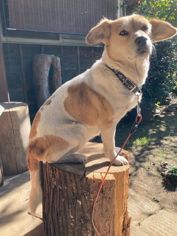 お昼過ぎに外へ出てみると、ハウザーは丸太の上で日向ぼっこ!