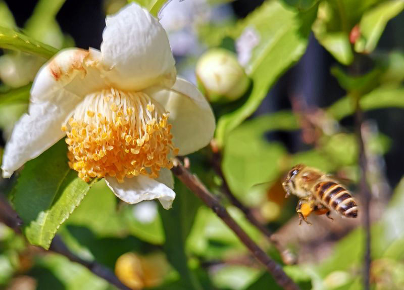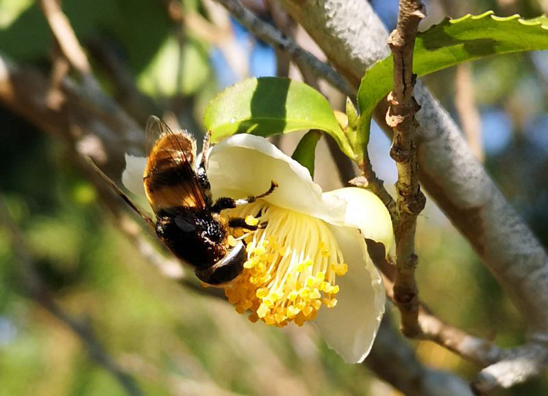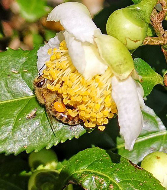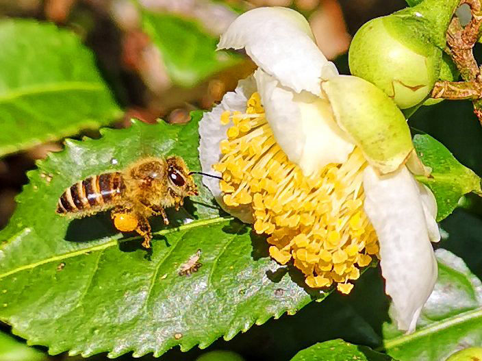 花粉がいっぱいのチャの花は、キウィと同様、蜜蜂の花粉ダンスが見られる花でもあります。どの娘も、大きな花粉団子をくっつけて、それでも未だ大きくするつもりのようです~♪