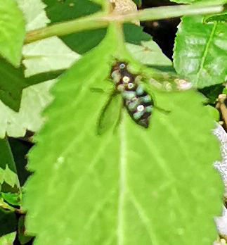 そこへ、美しい瑠璃色の昆虫が飛んできました。私は目が見えてないので、細かい様子が判らないけど、とりあえず、瑠璃色を追って写してみました。