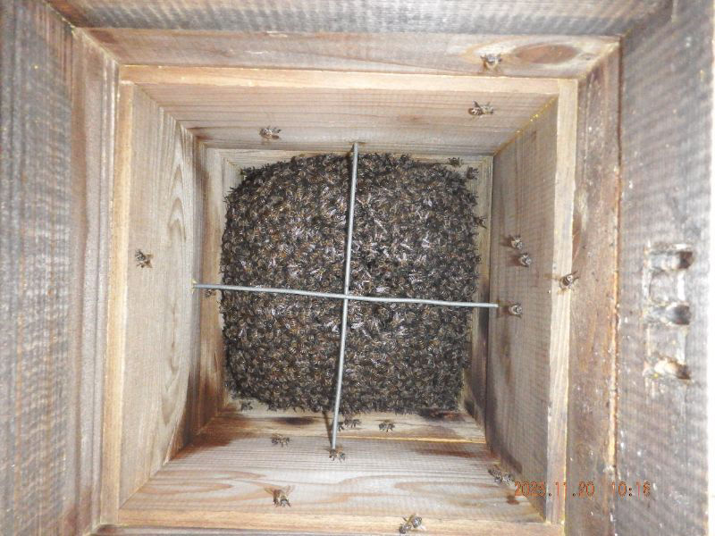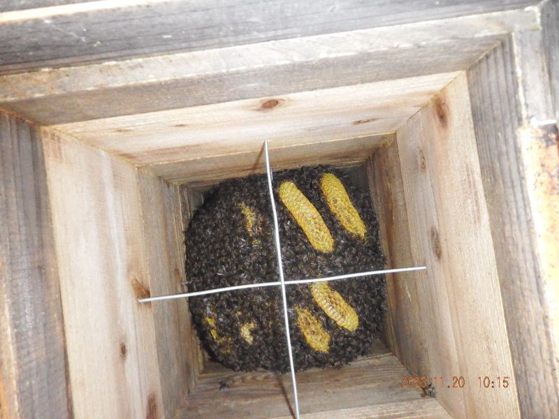 令和7年11月18日 火曜日 大分山荘にて:全群の目視確認を2週間ぶりに行いましたね。No.10冬越し群はこの前巣版が落ちて居ましたが、残って居た幼虫も出ていま