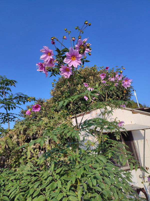 真っ青な青空に赤紫の皇帝ダリア、それを訪れる多数の西洋ミツバチ