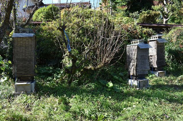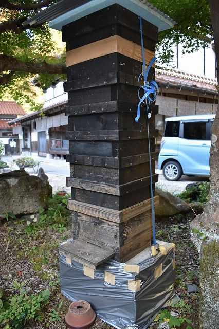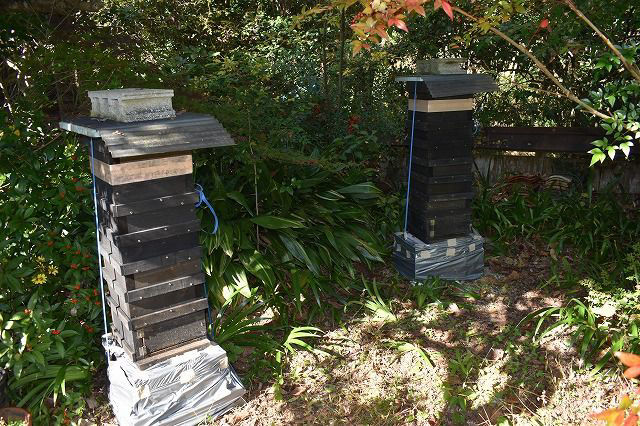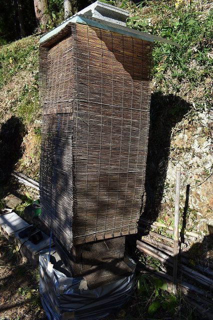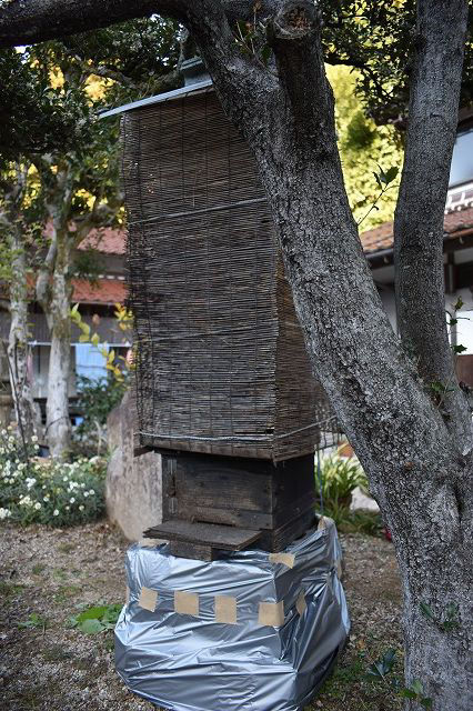 元気な群は土台部分をコンパネ板で塞ぐだけですが、巣板が見える群は土台部分を銀マルチで覆いました。