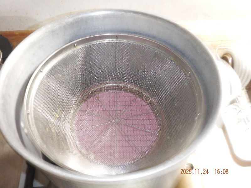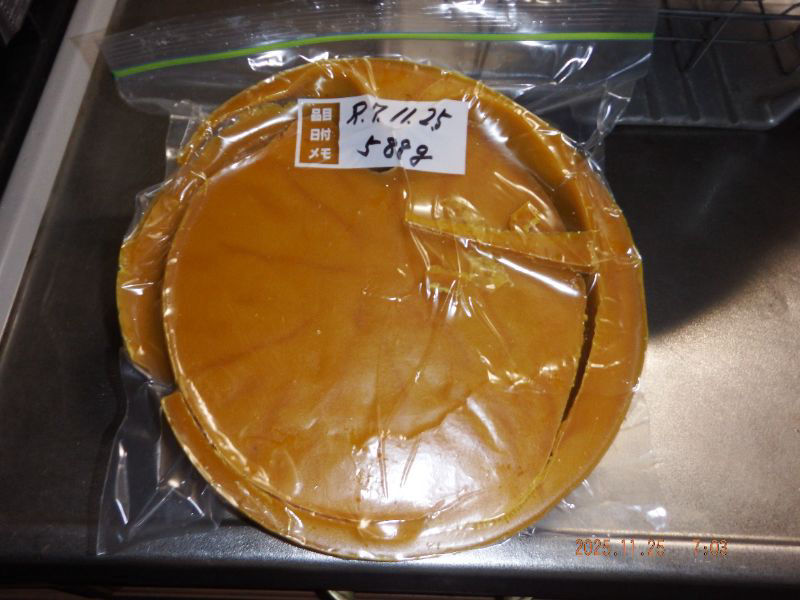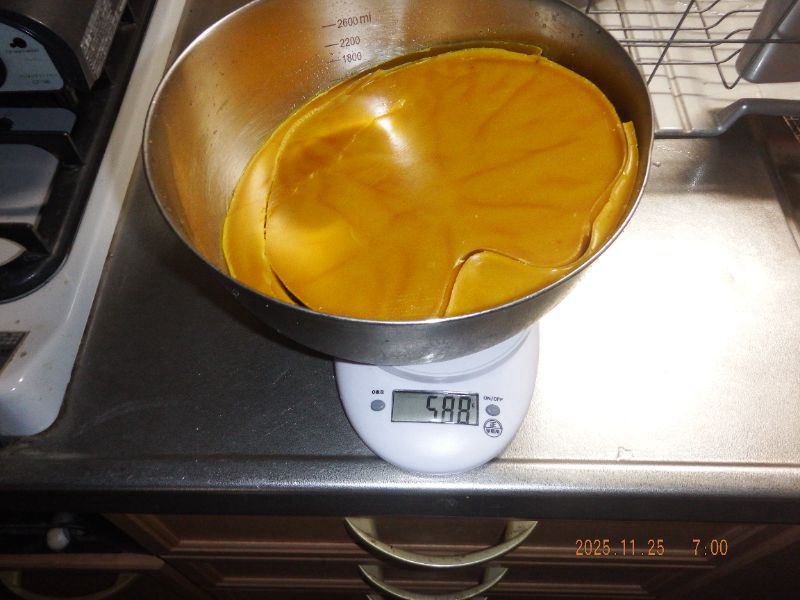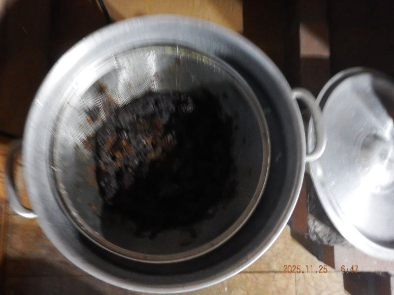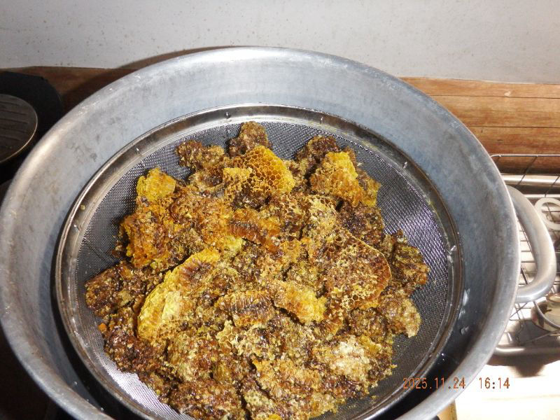 令和7年11月25日 火曜日 大分山荘にて:24日夕方蜜蝋抽出を山荘内で行いましたね。黒蜜に蜜蝋も多く採れましたね。