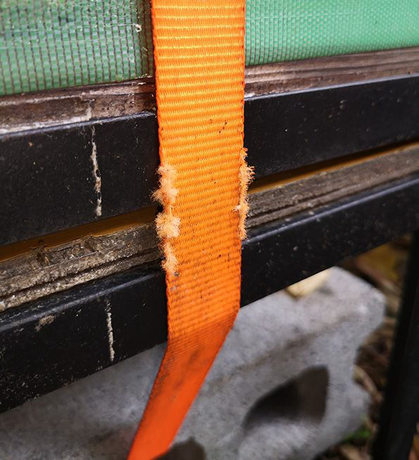 防護ネットは16mmで、自由に大スズメがすり抜けられるので咬み切られたりはしなかったですが、箱を固定しているラチェットベルトは、オオスズメにとって、このベルトのせいで中に入れないと思ったらしく、何度も齧られていました。ハサミの刃くらいの威力がありますね。。