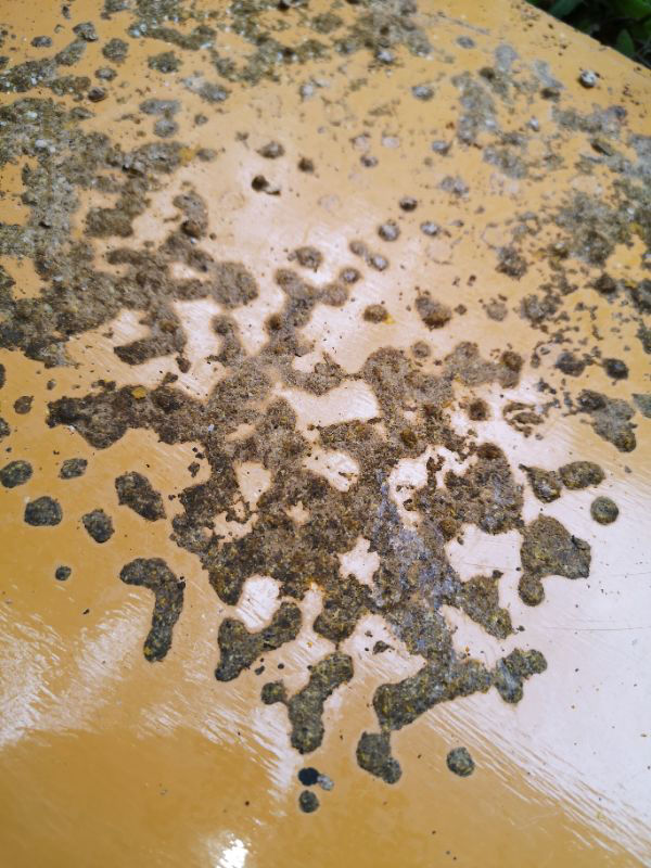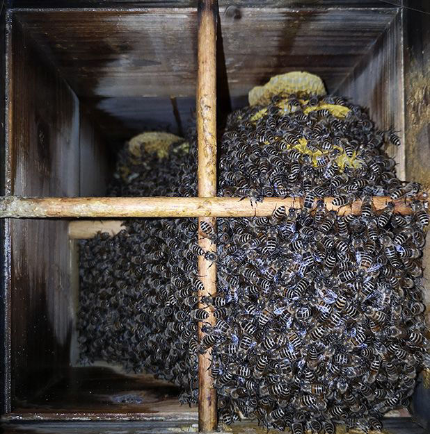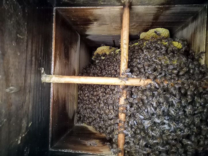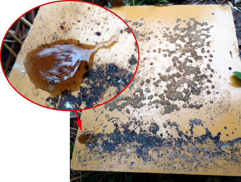 底板を抜いてみると、丁度内壁を伝って、巣門の近辺に垂れて来てます。茶色いほうじ茶のような色ですが、斜めにしたら流れてしまいそうな水っぽさで、粘度はありませんね。さすがに、舐める勇気はありません。極度の食物アレルギー持ちですから(^^; 極近で臭いを嗅いでみましたが、、、良かったぁ~!蜂蜜の匂いはしません(≧▽≦) それなら何だろう??と、急遽、内検してみました。