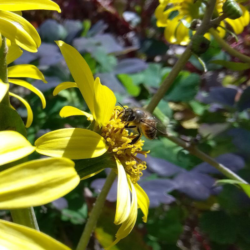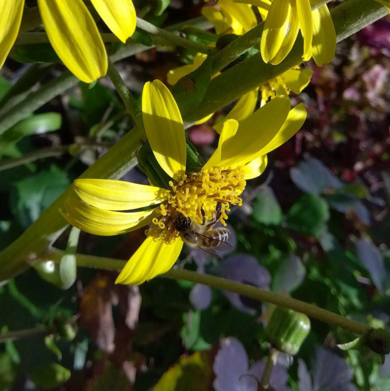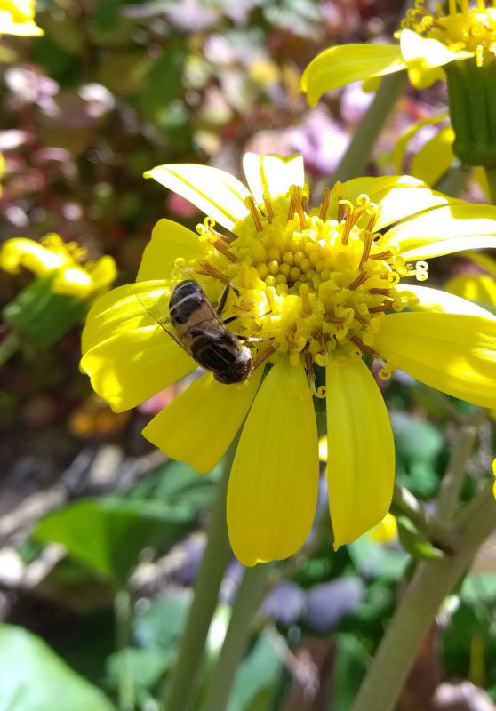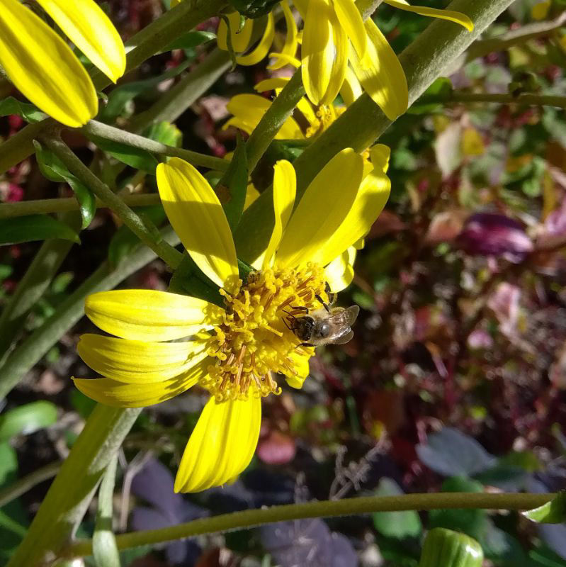 日本みつばちも訪れて吸蜜、花粉集めしてやはりツワブキも有難い植物ですね。