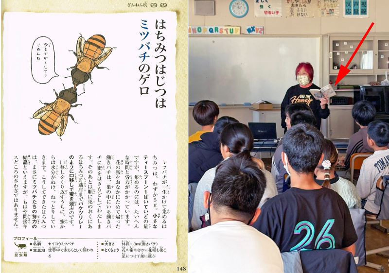 それは、「蜂蜜は、ミツバチのゲロ問題」です(;^_^A 小学生が大好きなシリーズ本「ざんねんな生き物事典」に掲載されているミツバチに関する内容に衝撃を受けたので、紹介した時の事でした。