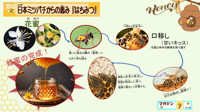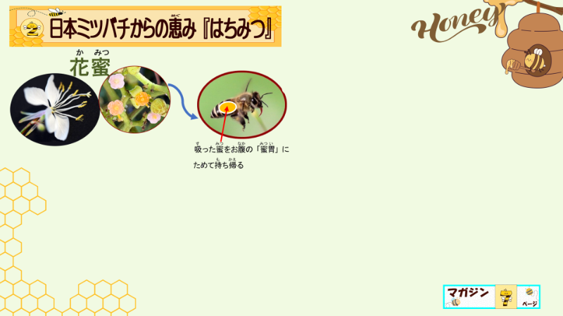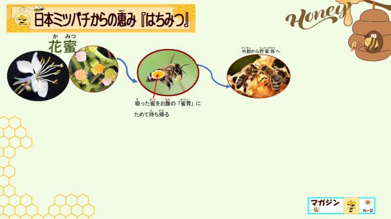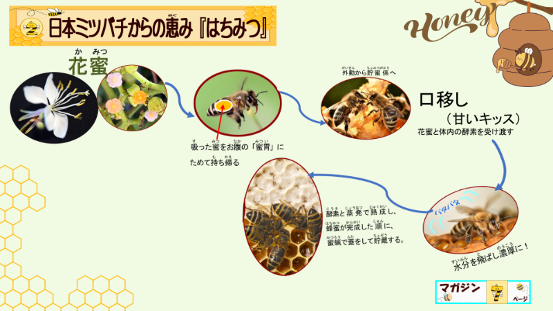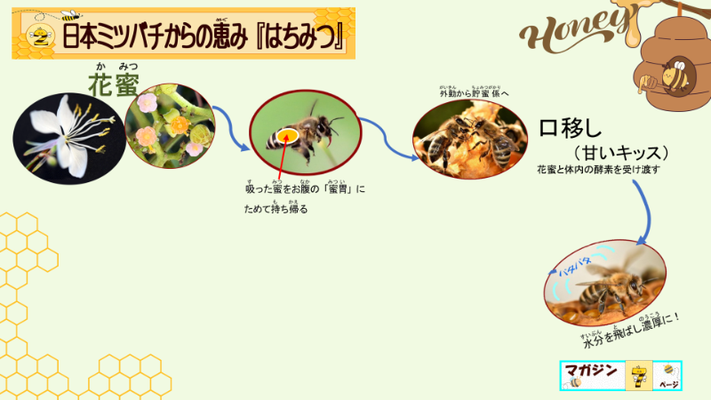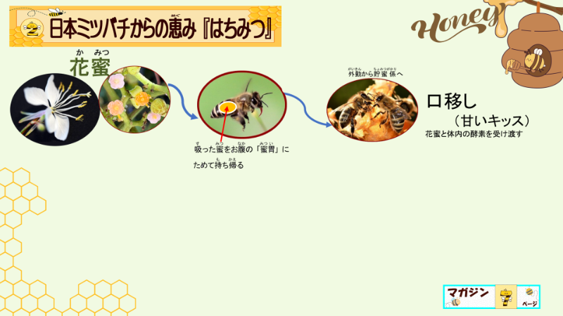 しかも、蜜胃からバトンリレーする際にも、この酵素の加えられた花の蜜になる事が重要なんだと強調しましたよ。だから、その後、大事そうに蜂蜜を味わっていたと、日誌には書いてありますよ。子供達は、この口移しがとても大事な行為なのだと納得できたからでしょう。どんな授業になったか、察する事ができないようでしたら、蜂蜜のできる工程のプレゼンテーションだけでも、具体的に載せますね。