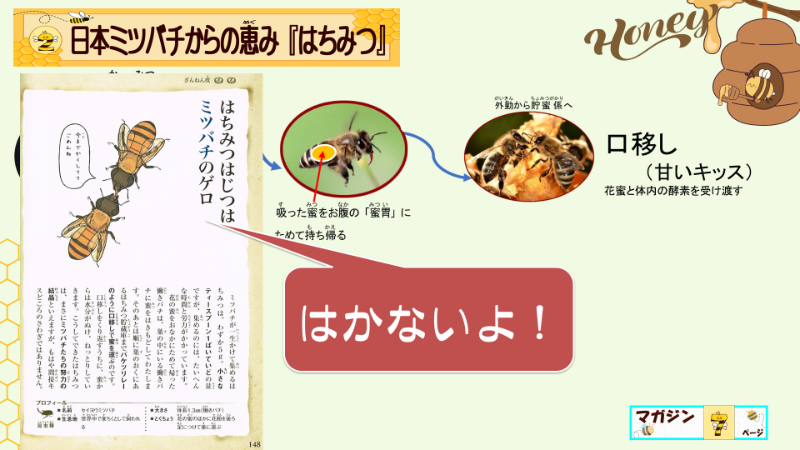 30人のうち、蜜蜂のゲロのページを読んだことがある、所有しているという子は、約半数でした。初めて見た子は、一旦チョッと引きましたが、大事なのは、このリレーバトンが無いと、花蜜は蜂蜜にはなれないという事をしっかり説明しました。