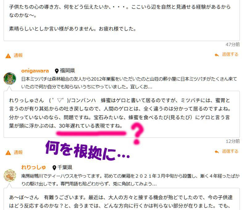 しっかりと私の本文を読まれた方々は、よくぞ、子供達に補足してくれた。蜂蜜は、ミツバチの体を通す事が大事で、その酵素の受け渡しが、ただの花の蜜よりも数段栄養のある蜂蜜に変化させるのだから。その事を子供達に加えてくれたのは素晴らしい!と賛同してくださると思って居ますが。。。?