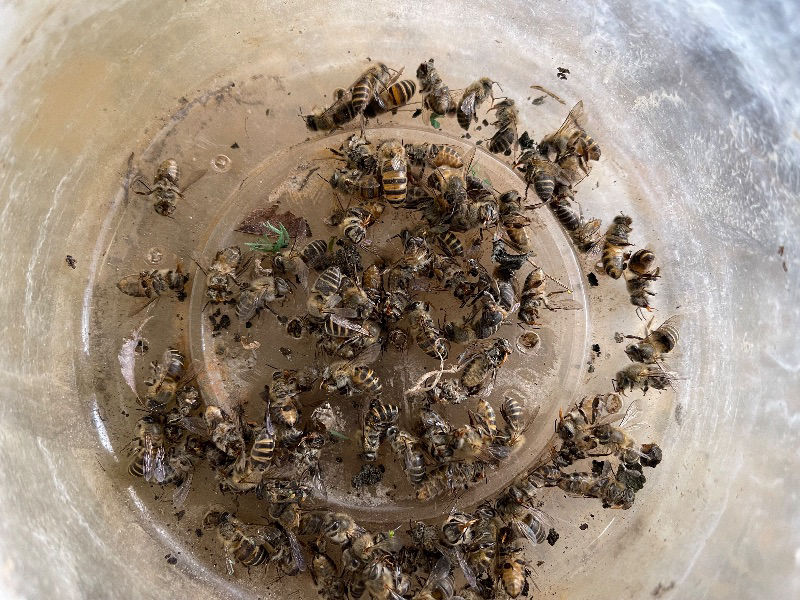 bee_yakaさん こんにちは 蜜蜂の亡骸は赤い舌が見えますので、農薬と考えられますね。近くに果樹園とか有ると多いですね。お疲れ様でした。