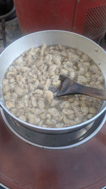 昨日頂いた イノシシの内脂をしょうやく(薄皮についた血合いをとる)し適当な大きさに切り入れますその時 僅か水も入れます。 湯煎が良いですが非常に時間がかかります。