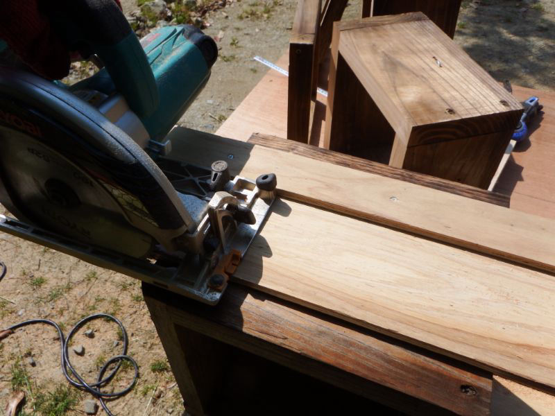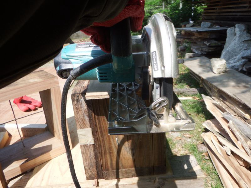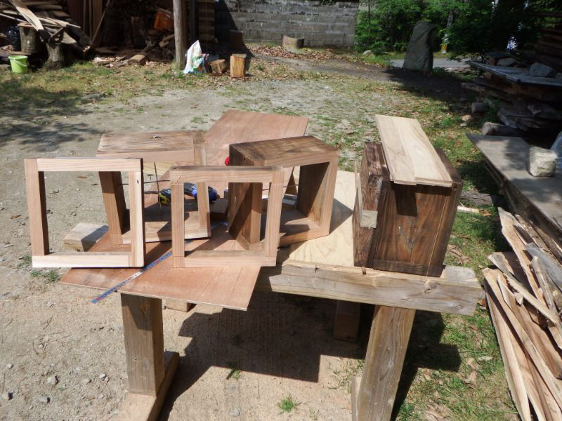 カット中の200mm巣箱ですね。左の2個がカットが終わった巣箱ですね。丸鋸で簡単に綺麗に出来ましたね。