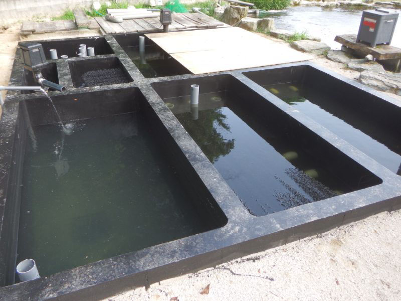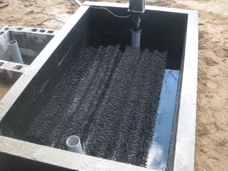 浄化菌を湧かせるための浄化槽ですね。黒い色は錦鯉池用の塗料ですね。