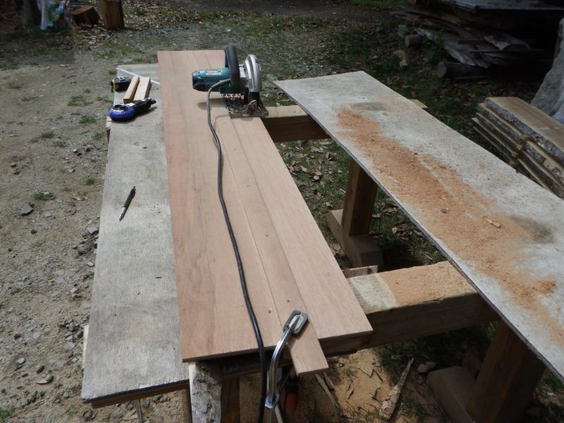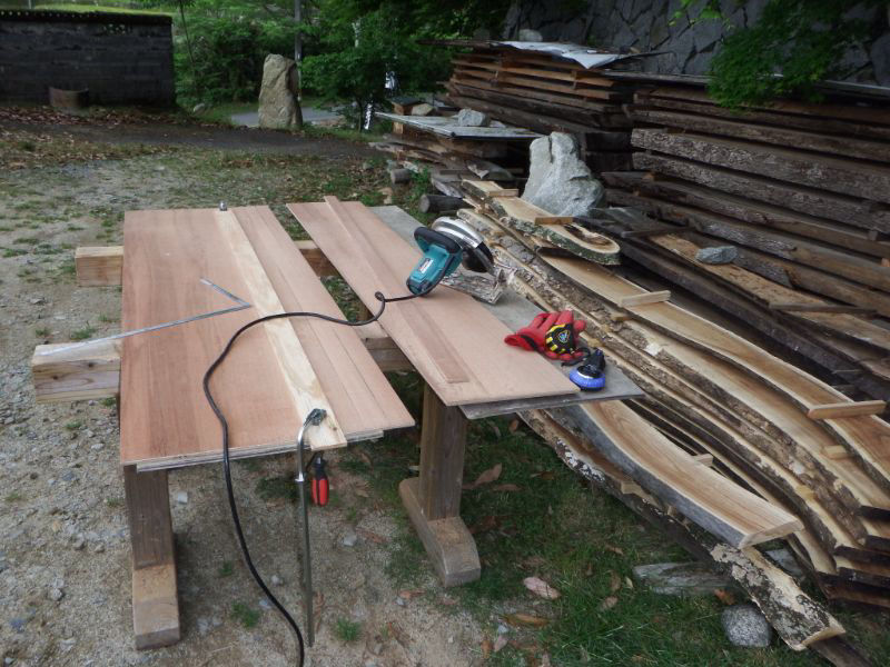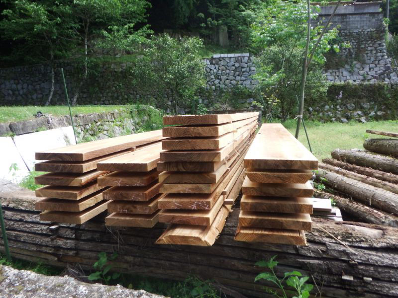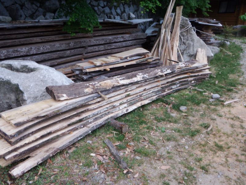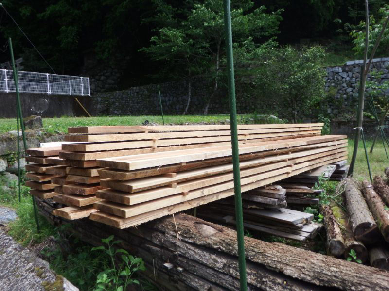 畑に置いて居る杉板ですね。平成29年に流されてしまいましたね。製材所での製材は高い感じがしますが、255mmでカットして1枚は100~200円になりますので、かなり安いですね。運賃とか入れると、購入したのと同じくらいになるかもですね。