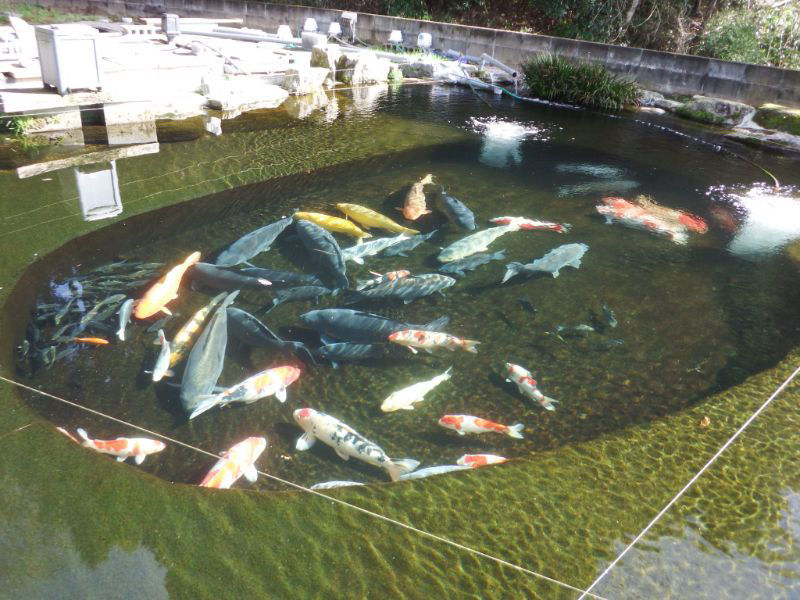 一番大きい鯉は1mで20kg有りますね。小さい鯉が見えますが、此処で生まれて浄化槽の中に居たのを網で掬い入れた鯉ですね。好い鯉を入れても入れても死ぬので、浄化槽を作りましたね。