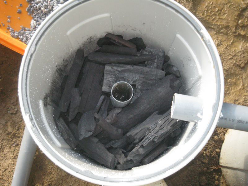 3番目のポリバケツは自分で焼いた炭を入れて水槽に使用する濾材を入れて居ますね。