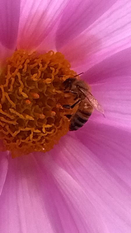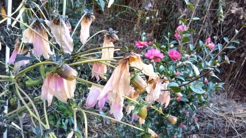 けさ霜が降りて、昨日まであんなに咲いてたダリア、全滅。葉っぱは真っ黒、花は萎んで垂れ下がり。脇の山茶花はヘッチャラ。それでも萎んだダリアに若干訪花していた。