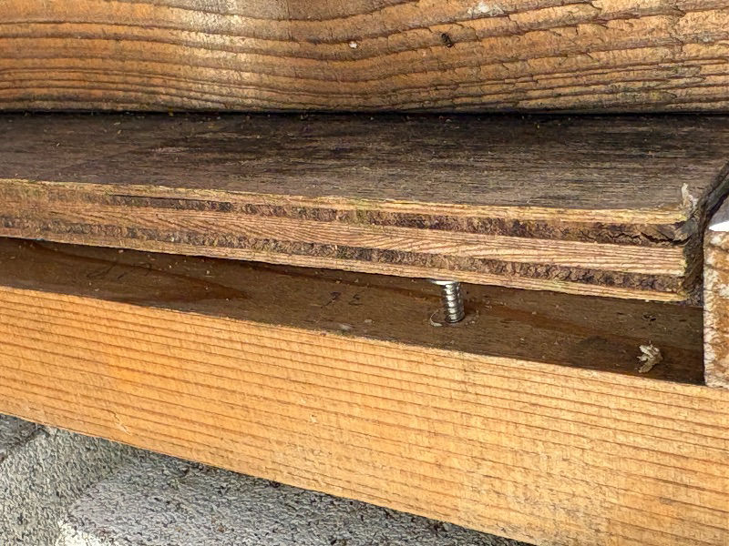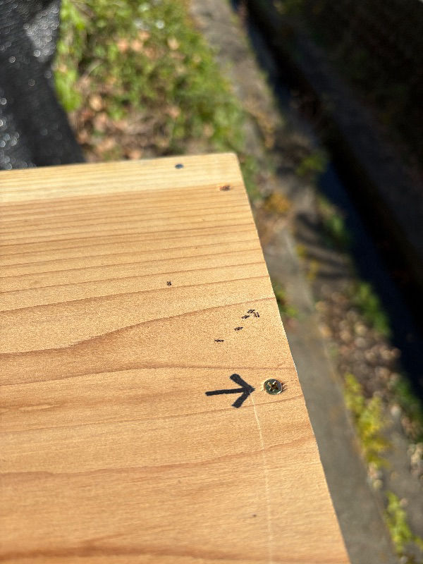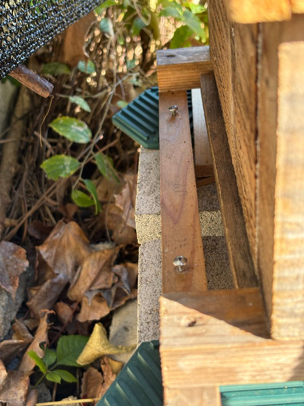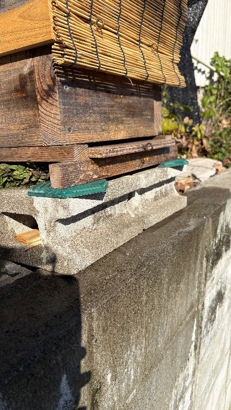 この巣箱は前後2面巣門、裏口を閉める事にした。やり方は、裏口の巣門高さを調整しているネジを回せば良い仕様のつもりが、ネジが短すぎたので、長いネジと交換して、裏口の底板を押し上げて裏口ナイナイ冬仕様にした。