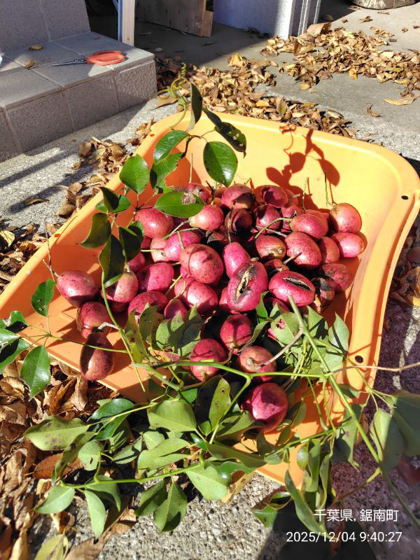 庭の隅に生った郁子(ムベ)を収穫した。今年は蜂たちの働きで受粉がうまくいったのか、本当のことはわからないが、去年の倍以上の実が生ったので良いことにしましょ。特に美味しいとは思えないが珍しいのと蜂が喜ぶようなので食べた実の種をカクレミノ同様に種まきをして苗を作ろうと思います。