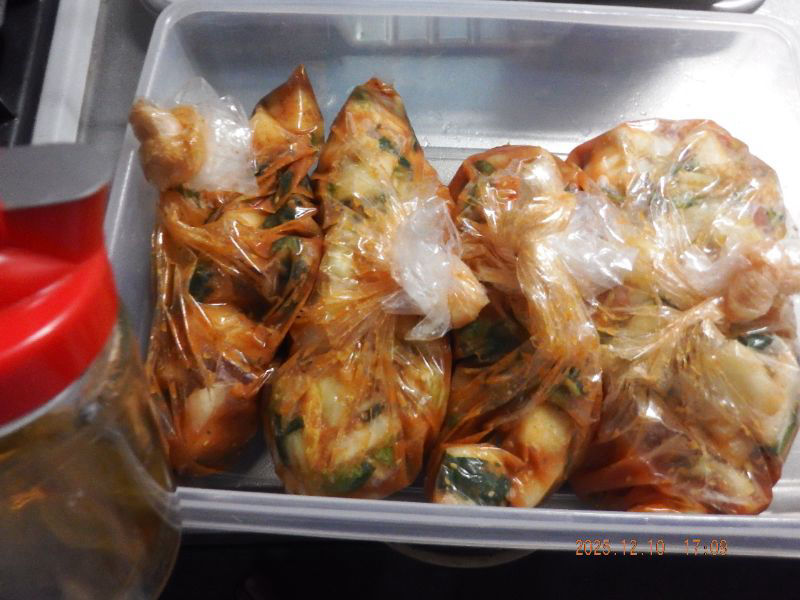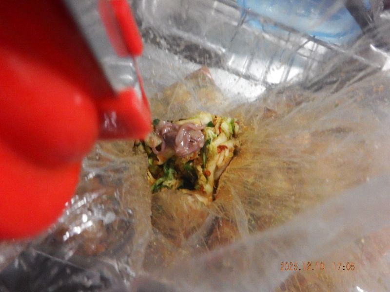 12月10日17時05分:味見をして、イカの塩辛と日本蜜蜂の蜂蜜を足しましたね。大匙1杯くらいですね。少し甘味が出て良い感じに成りましたね。
