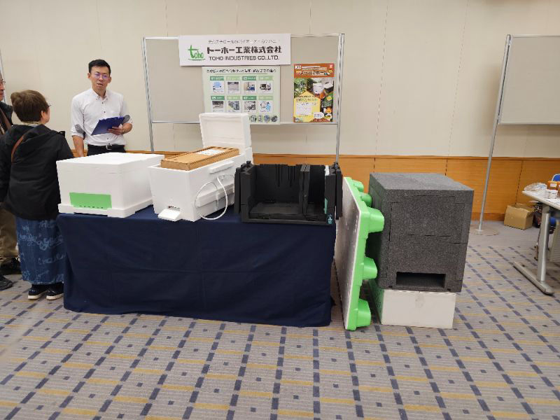 木箱(恐らくラ式)そのままとそれを同社のミツバチホームPROに入れた場合で、4ヶ月の巣箱(貯蜜)重量比較と冬季と夏季での巣箱内温度変化を展示されてましたが、少なく共、セイヨウさんは発泡スチロールを気にしないんだなぁと思いました。