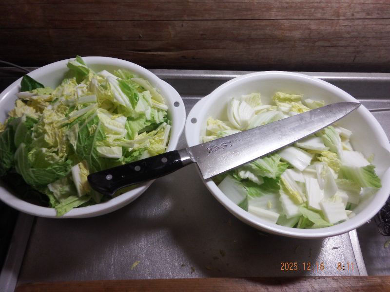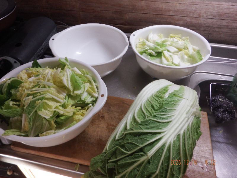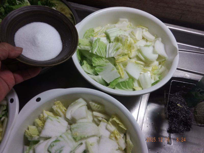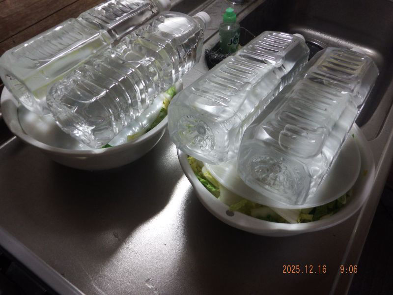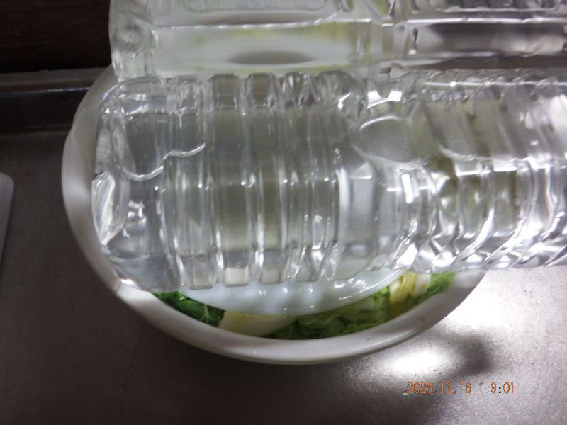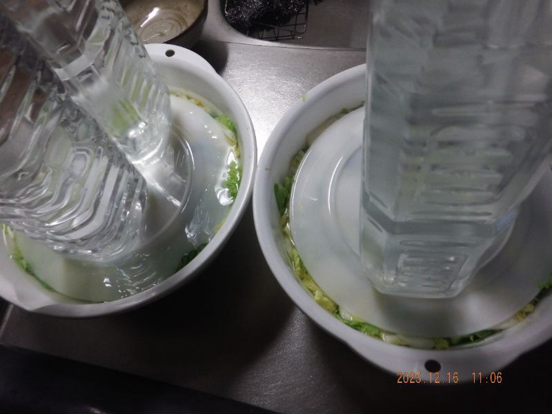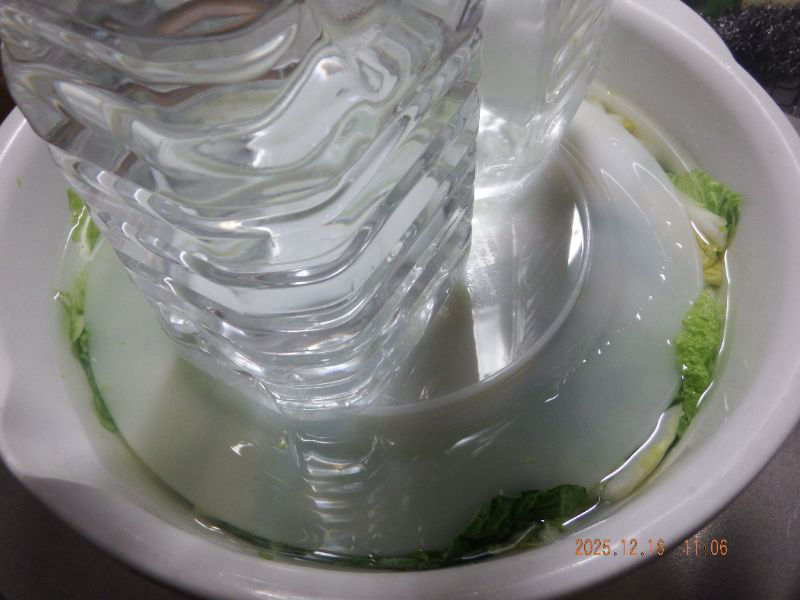 白菜の根元だけ100gの塩を振って30分後ですね。500ccの水を加えて葉の方も一緒に混ぜ込みますね。3時間此れで置きますね。