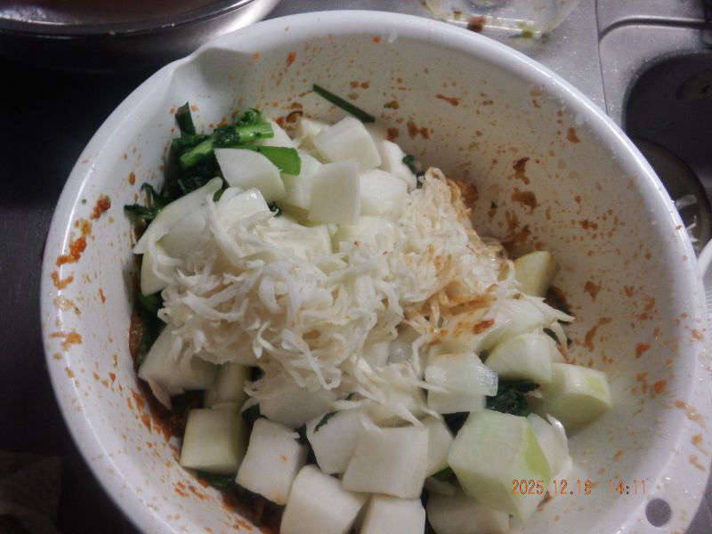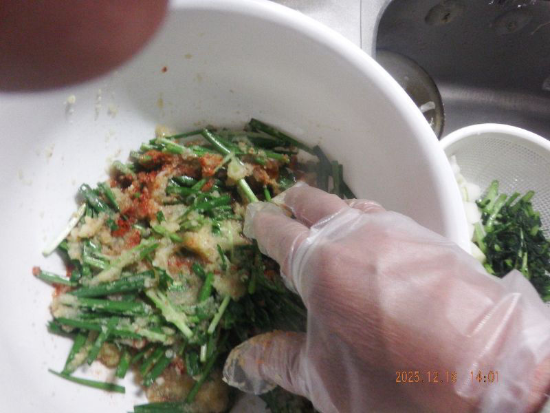 ヤンニョムの材料を混ぜて居ますね。