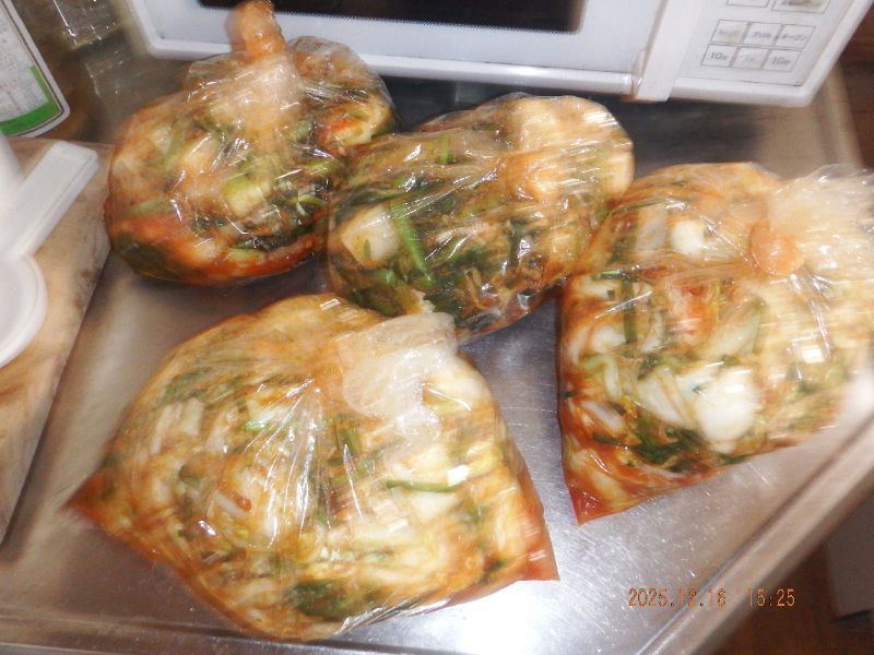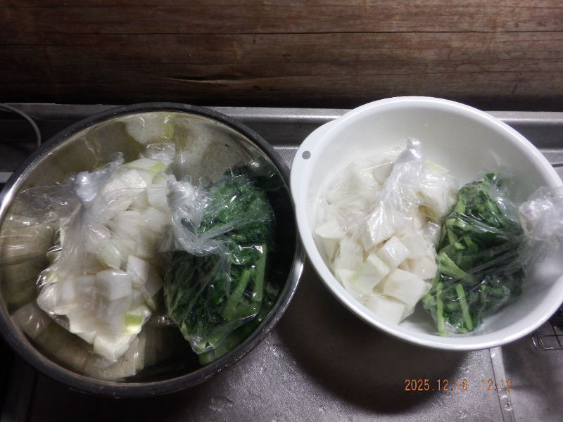 大根葉は3~5cmくらいにカットして塩を振って置きますね。ビニル袋が好いですね。