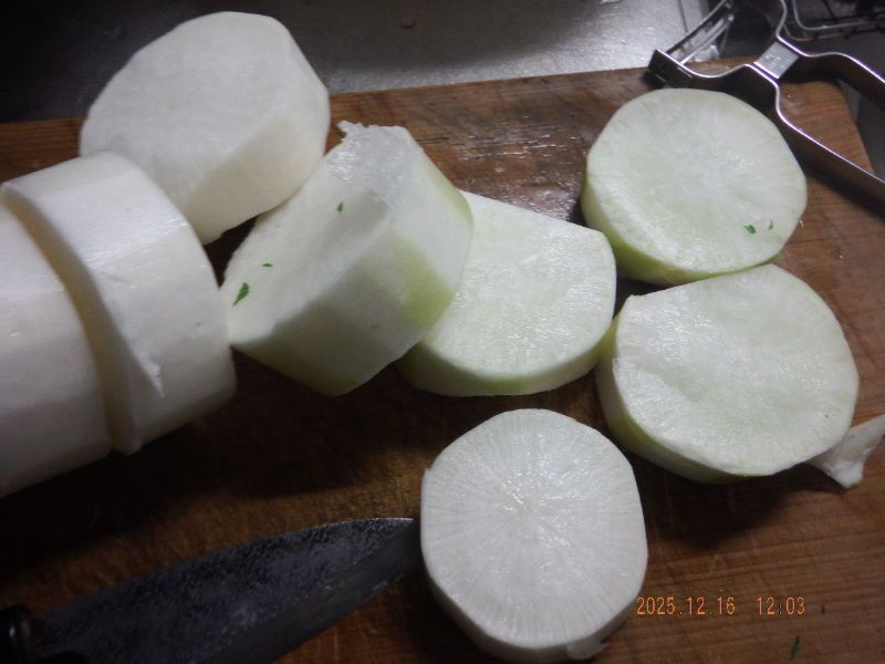 大根は食感が良い皮を少し残して皮を剥いでいますね。