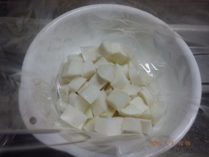 2~2.5cm角くらいにカットしますね。余り小さいと食感が無くなりますね。