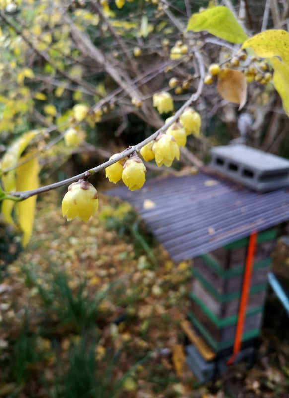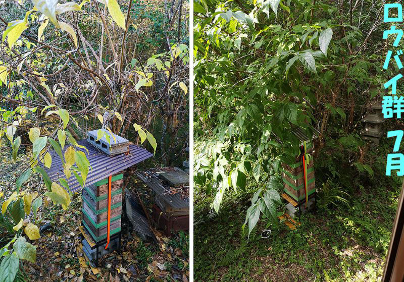 私が蜂場選びで出した結論の一つは、落葉樹のスッポリ入れる木陰である事です。予想通り、この蝋梅の木陰は、酷暑でも何とか乗り切れたし、11月末の寒くなってきた頃からは、落葉して日当たり抜群です!